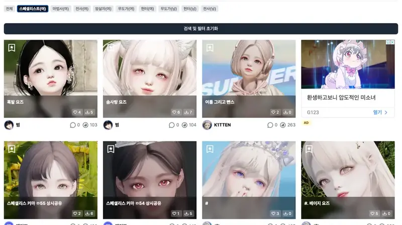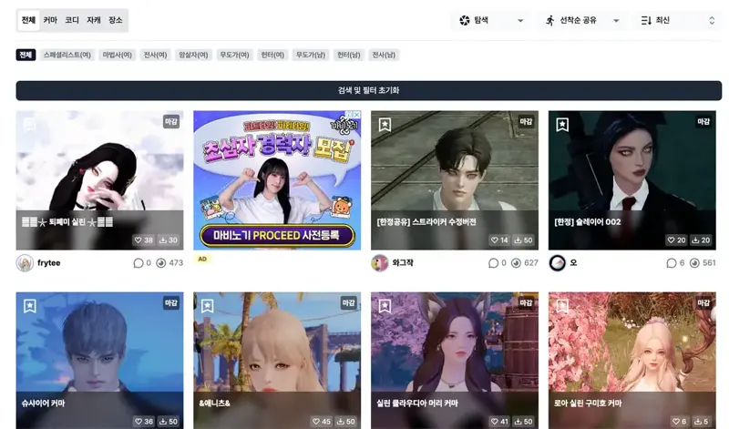 메인페이지에서는 카테고리와 다양한 필터등을 통해 원하는 커마(Preset, 프리셋)를 탐색하기 편하게 구성되었습니다.