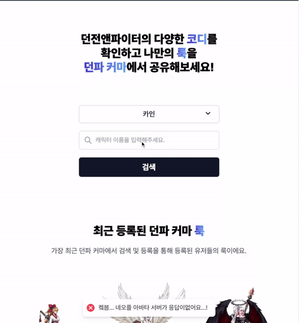 만일 Neople API 서버로부터 응답이 비정상적인 경우 위와 같은 토스트알림이 나타납니다.