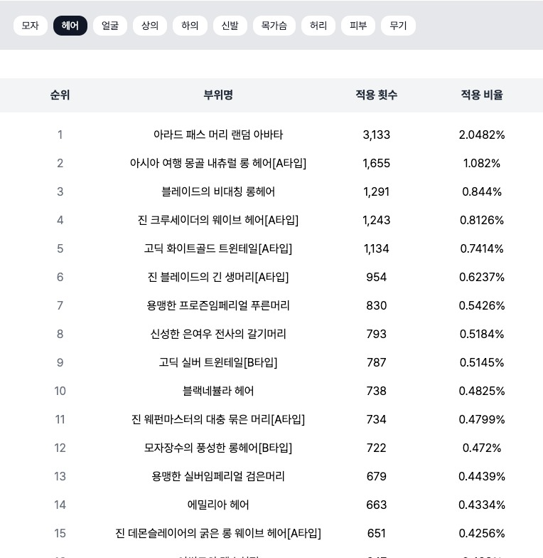 통계 페이지를 통해 가장 많이 장착한 아바타의 상위 100개의 목록을 확인할 수 있습니다.