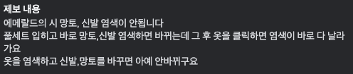 혹은 망토/무기/신발 을 염색후 상의를 클릭시 염색이 반전되거나 해제되는 등의 이슈로 파악되었습니다.