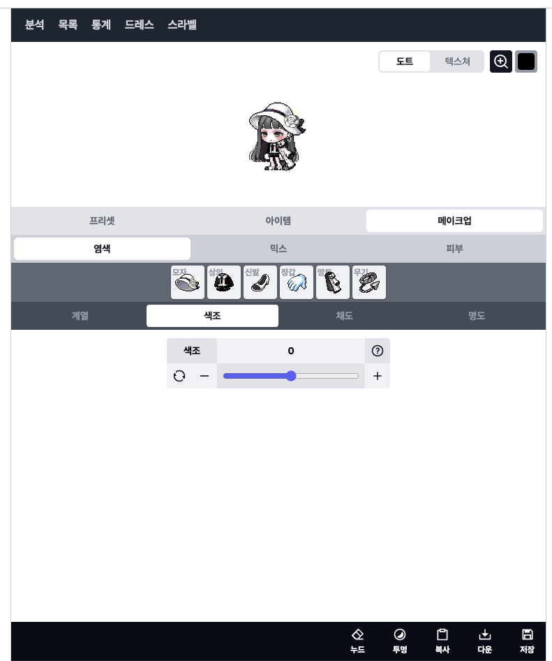 초기 드레스룸에서 구분되었던 탭 중에서 염색/믹스 기능과 피부를 캐릭터를 메이크업한다는 느낌으로 한곳으로 몰아서 구성하였습니다.