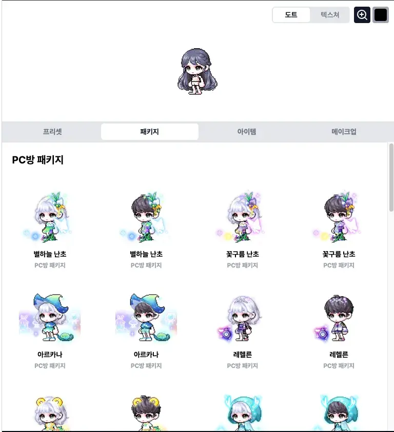 드레스 룸 -> 패키지 탭에 프리미엄 PC방 의상 선택 상자에서 획득 가능한 패키지 항목이 추가되었습니다.